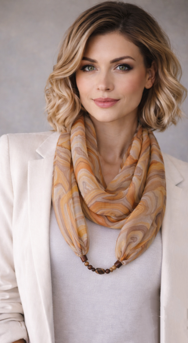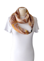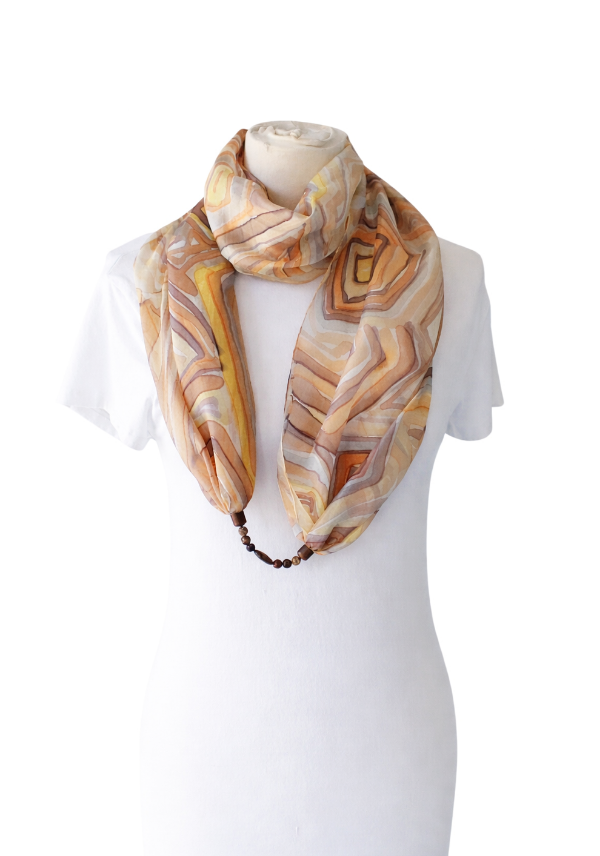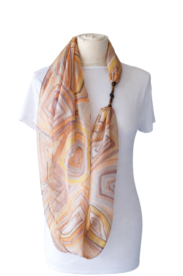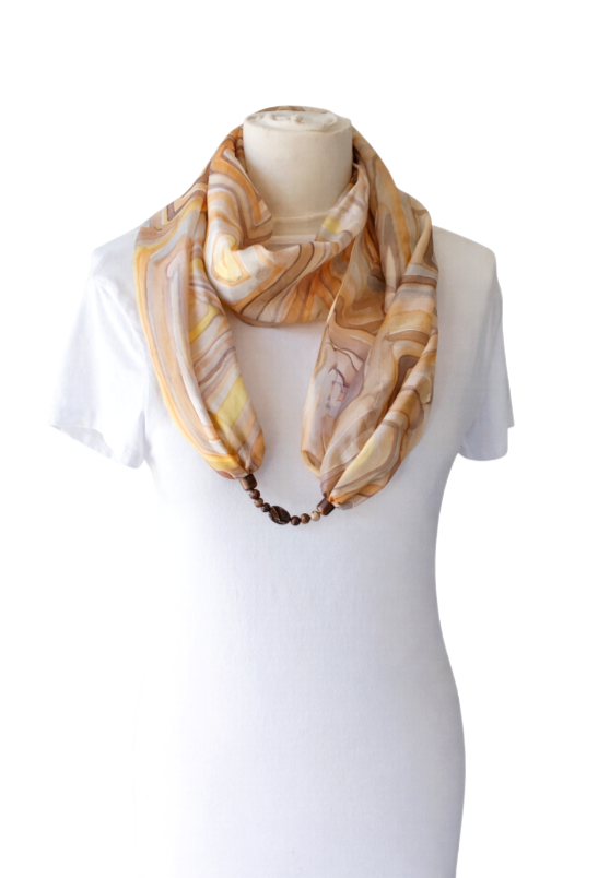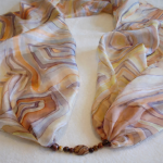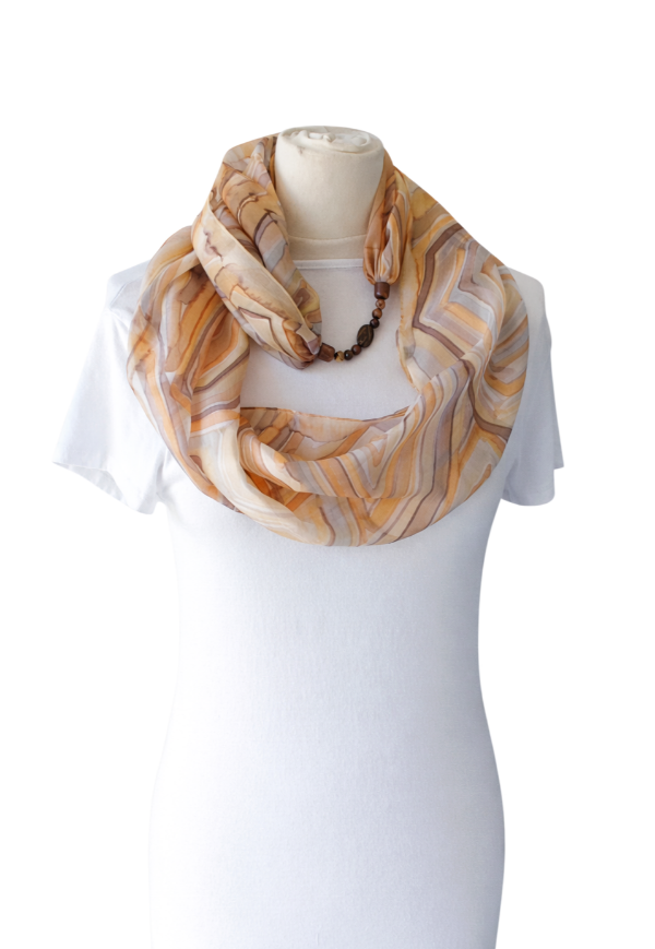 Achát ásványra emlékeztető mintájú hernyóselyem ékszersál bézs, barna, narancs, szürke színekben, achát és jáspis ásványgyöngyökkel, achát medállal a közepén. Az achát és a jáspis nyugtató ásványok, oldhatják a stresszt, gyógyíthatják az érzelmi sérülések okozta szívfájdalmakat, fejleszthetik a szellemi tevékenységet, az emlékezőképességet. Az achát erős földelő ásványfajta. A speciális hatású ásvány-gyöngyök és a selyem kombinációja egyedi kiegészítőt hoz létre, és harmóniát nyújt viselője számára. A körsál vállunkra terítve elegáns és kényelmes stóla is lehet. A selyem sokféle alkalomra hordható, könnyed viselet, az öltözék elegáns kiegészítője, ami színeivel az egyéniségedet, hangulatodat tükrözi. A hernyóselyem különlegessége, hogy nyáron hűt, télen fűt, és véd az elektroszmog hatásaitól. Mérete: 40×150 cm. Tisztítása: kézi mosással, folyékony mosószerrel. Vasalás magas hőfokon, a teljes száradás előtt. Az ásványokat folyóvízzel tisztítsuk.