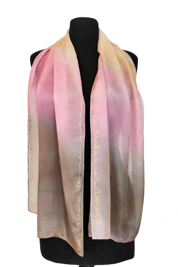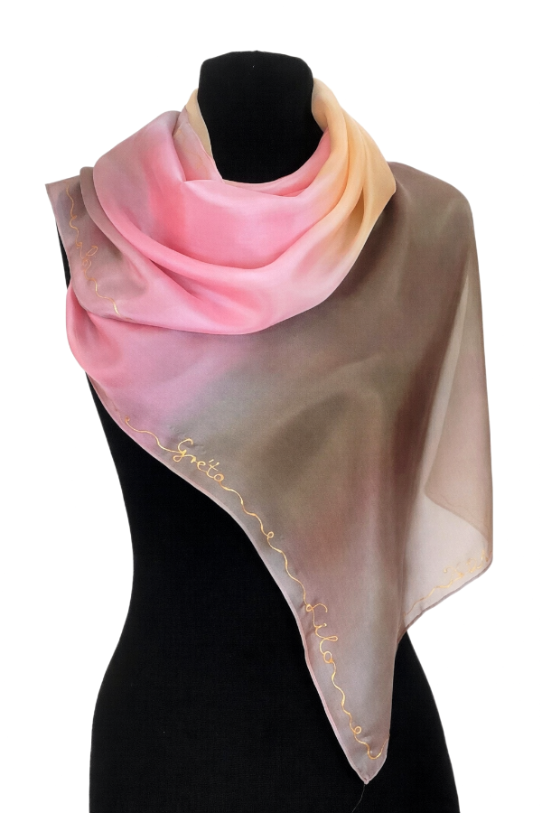 A ballagó gyerekek keresztnevei hullámvonallal összekötve, színátmenetes, kézzel festett hernyóselyem sálon, barna, bézs, rózsa színekben. A gyermekek nevei arany vagy ezüst kontúrral kerülnek a selyemsálra. További színösszeállítások a ‘színátmenetes selyemsálak’ címszó alatt tekinthetők meg. A gyermekek neveit az info@napselyem.hu emailcímre várjuk, a rendelésszám feltüntetésével. Sokféle alkalomra hordható, könnyed viselet, az öltözék elegáns kiegészítője, kedves, maradandó emlék óvónők, tanítónők számára. A hernyóselyem különlegessége, hogy nyáron hűt, télen fűt, és véd az elektroszmog hatásaitól. Méret: 45×140 cm. Tisztítása kézi mosással, folyékony mosószerrel. Vasalás magas hőfokon, a száradás előtt.