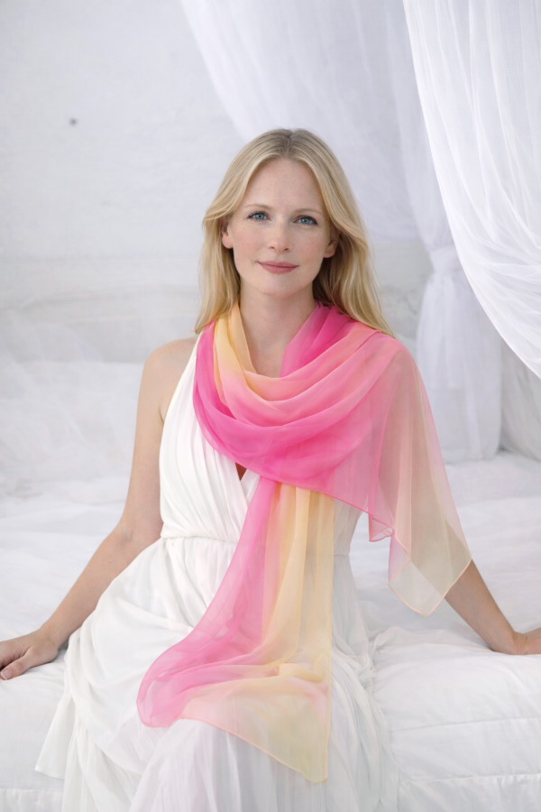 Rózsa, barack, vanilia színátmenetes, pasztell színű, kézzel festett chiffon (fátyol) hernyóselyem sál. Nem fényes, átlátszóbb és finomabb szövésű anyag, mint a klasszikus pongé, fényes hernyóselyemsál. Sokféle alkalomra hordható, könnyed viselet, az öltözék elegáns kiegészítője, ami színeivel az egyéniségedet, hangulatodat tükrözi. A hernyóselyem különlegessége, hogy nyáron hűt, télen fűt, és véd az elektroszmog hatásaitól. Egyedi ajándék hölgyeknek. Bármilyen színösszeállításban és méretben rendelhető. Mérete: 45×180 cm. Tisztítása: kézi mosással, folyékony mosószerrel. Vasalás a teljes száradás előtt, legmagasabb hőfokon.