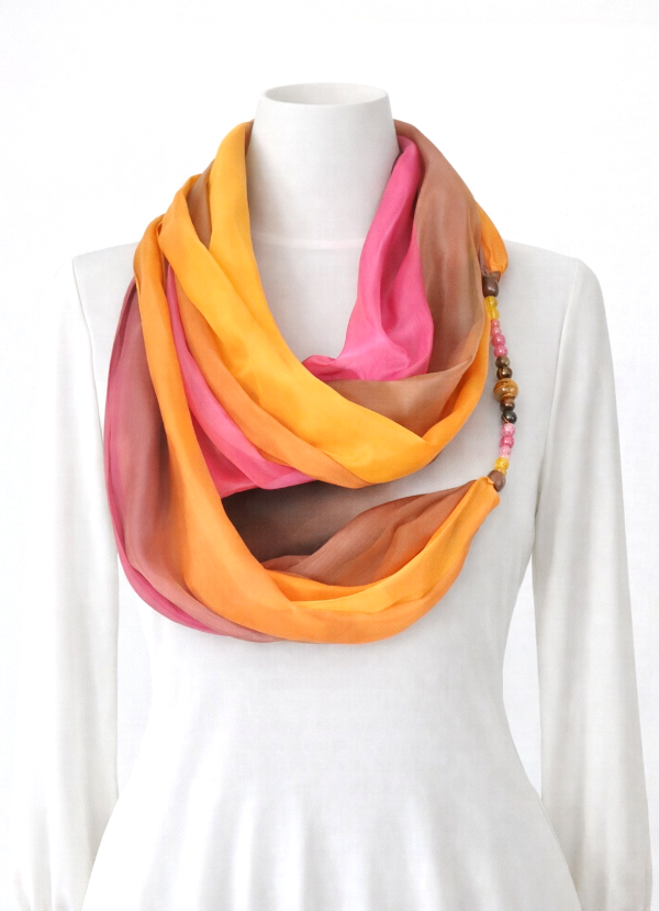 Barna, kármin, narancs kézzel festett hernyóselyem ékszer-sál, kalcedon, jégkvarc, tigrisszem ásványgyöngyökkel.