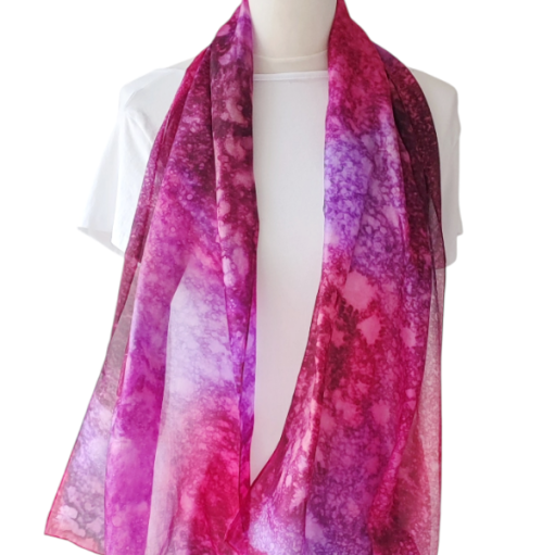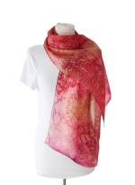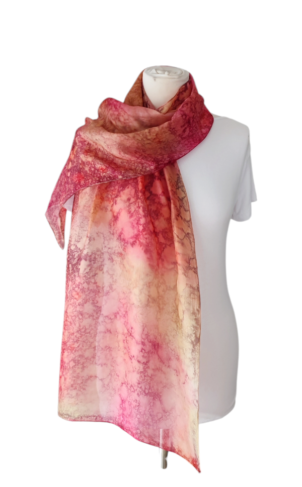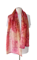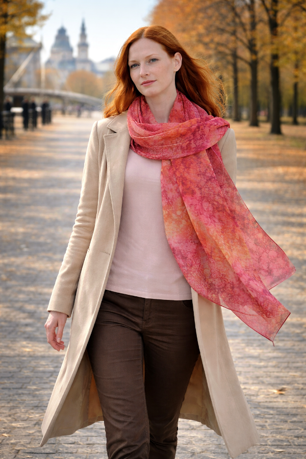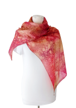 Organikus akvarell mintás hernyóselyem sál bézs, magenta, karamell, sötétbarna színekben. Sokféle alkalomra hordható, könnyed viselet, az öltözék elegáns kiegészítője, ami színeivel az egyéniségedet, hangulatodat tükrözi. A hernyóselyem különlegessége, hogy nyáron hűt, télen fűt, és véd az elektroszmog hatásaitól.