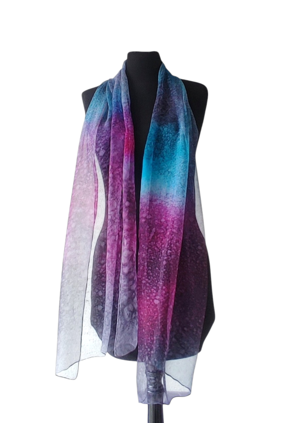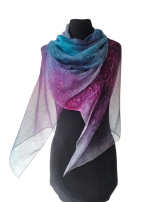 Organikus akvarell mintás fátyol, chiffon hernyóselyem sál türkiz, fekete, magenta, orogna színekben. Sokféle alkalomra hordható, könnyed viselet, az öltözék elegáns kiegészítője, ami színeivel az egyéniségedet, hangulatodat tükrözi.