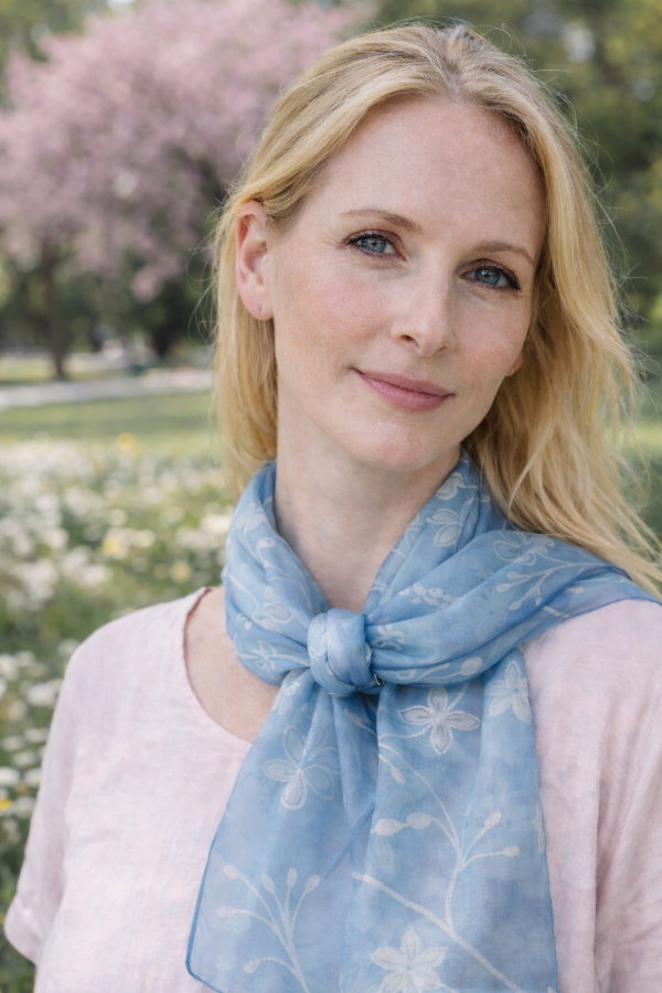 Virág-és levélmintákkal díszített farmerkék színű, kézzel festett hernyóselyem sál.