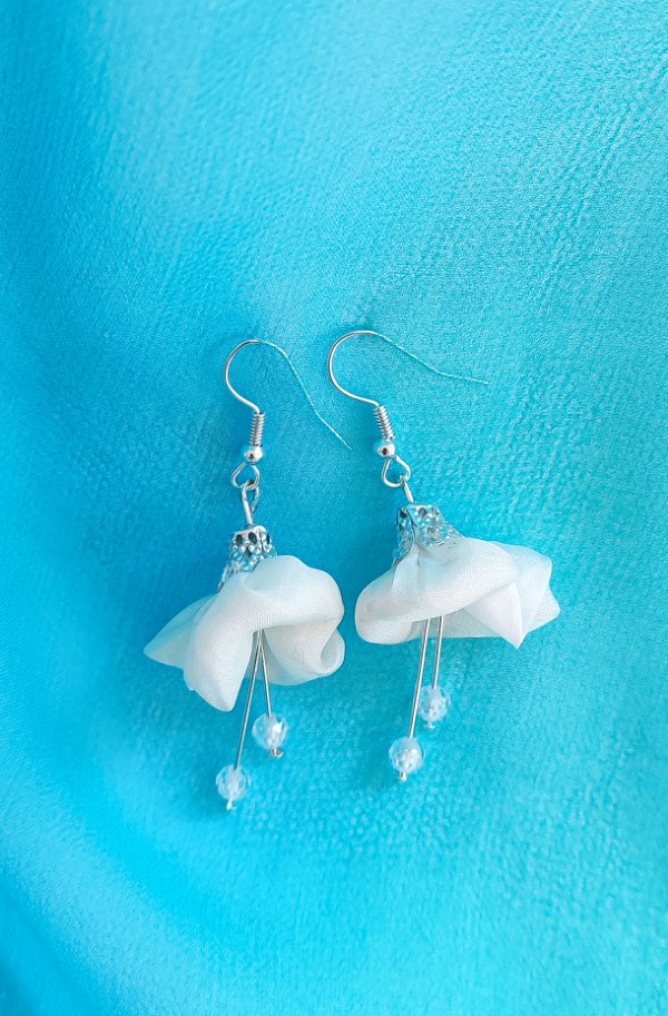 Fehér színű virág selyemfülbevaló, 2 fazettált cirkónium ásványgyönggyel, fém kiegészítővel, díszkupakkal. Belsejében gyapjú.
