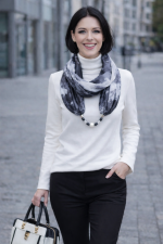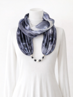 Fekete, fehér, szürke színű, márványos hatású, kézzel festett hernyóselyem ékszer-sál, lávakő, howlit ásványgyöngyökkel, közepén kerámia dísszel.