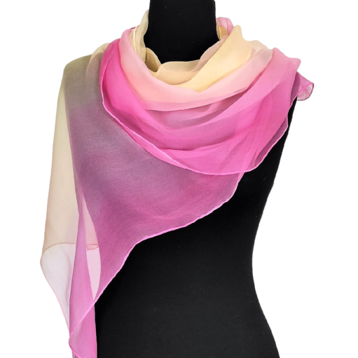 Fekete, magenta, babarózsa színű, színátmenetes, kézzel festett hernyóselyem sál.