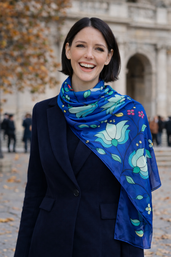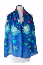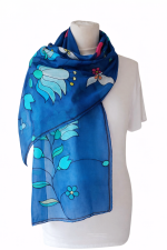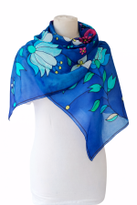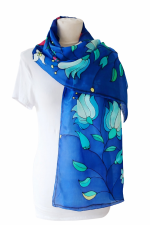 Kalocsai hímzés inspirációjára készült tulipán- és paprika mintás éjkék, magenta, türkiz, smaragd, királykék színű kézzel festett hernyóselyem sál.