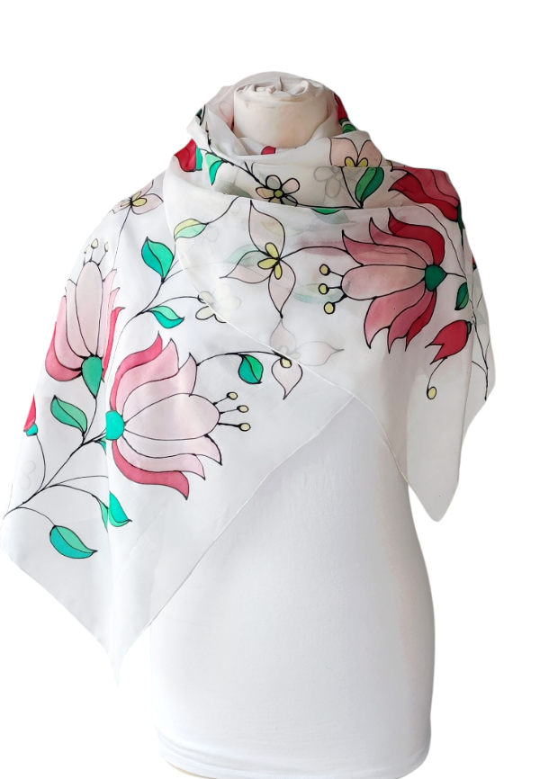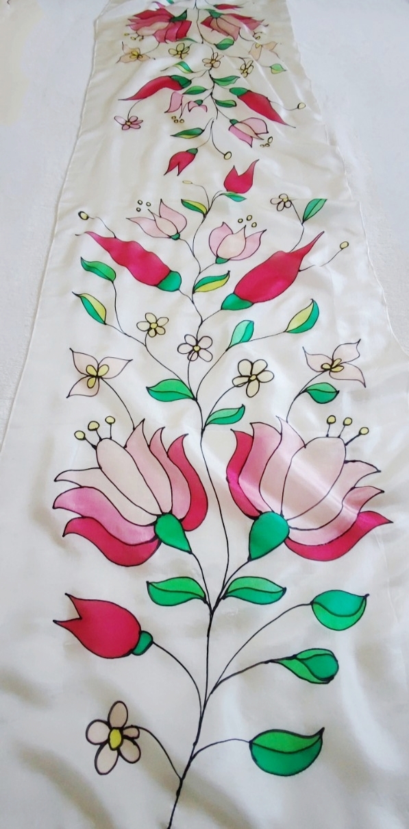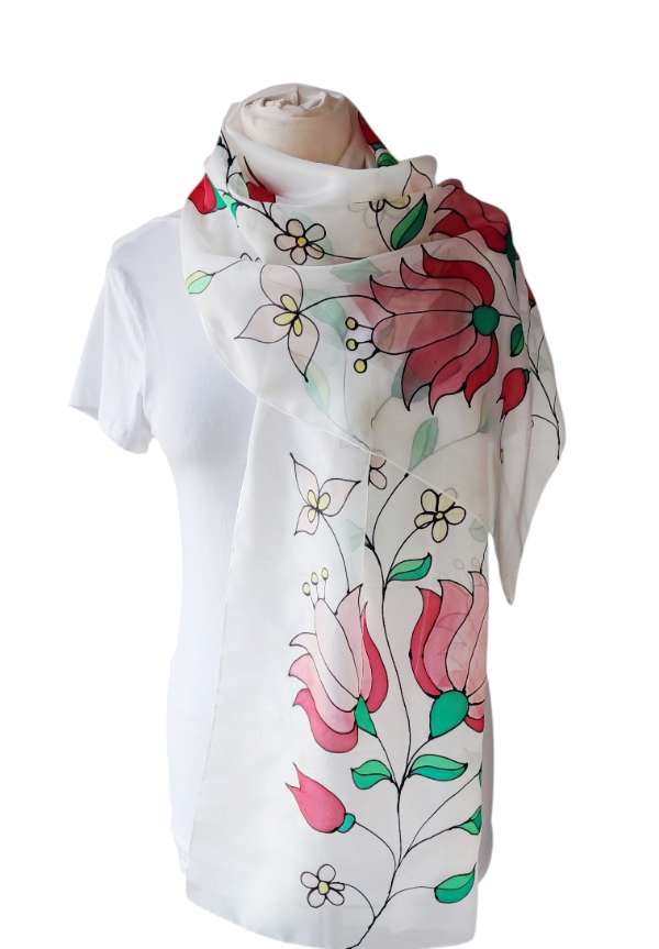 Kalocsai hímzés inspirációjára készült tulipán- és paprika mintás piros, füzöld, fenyőzöld, rózsaszín, sárga, kézzel festett hernyóselyem sál.