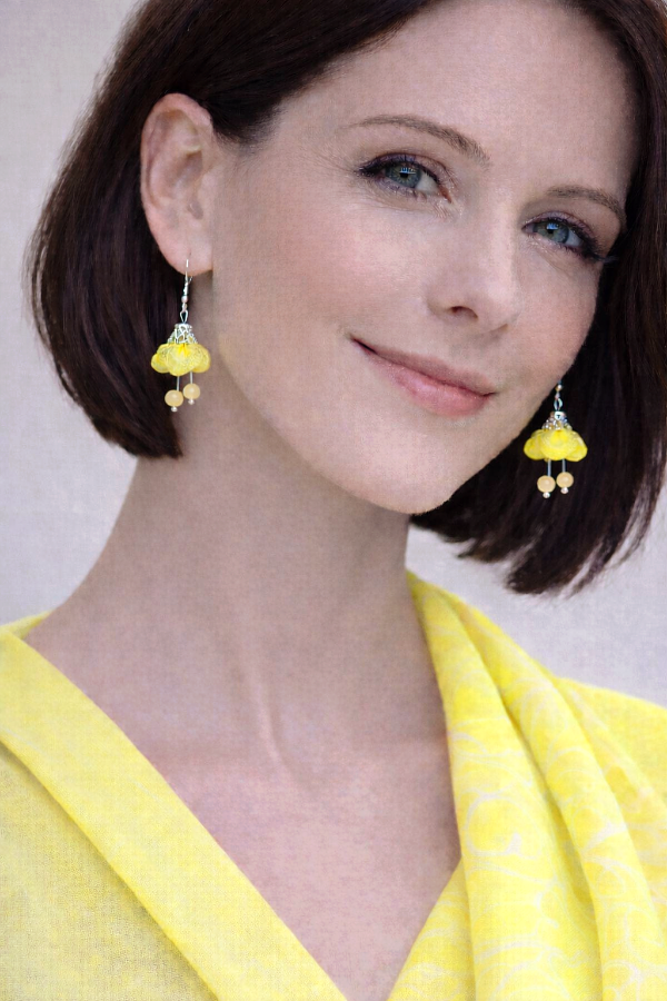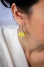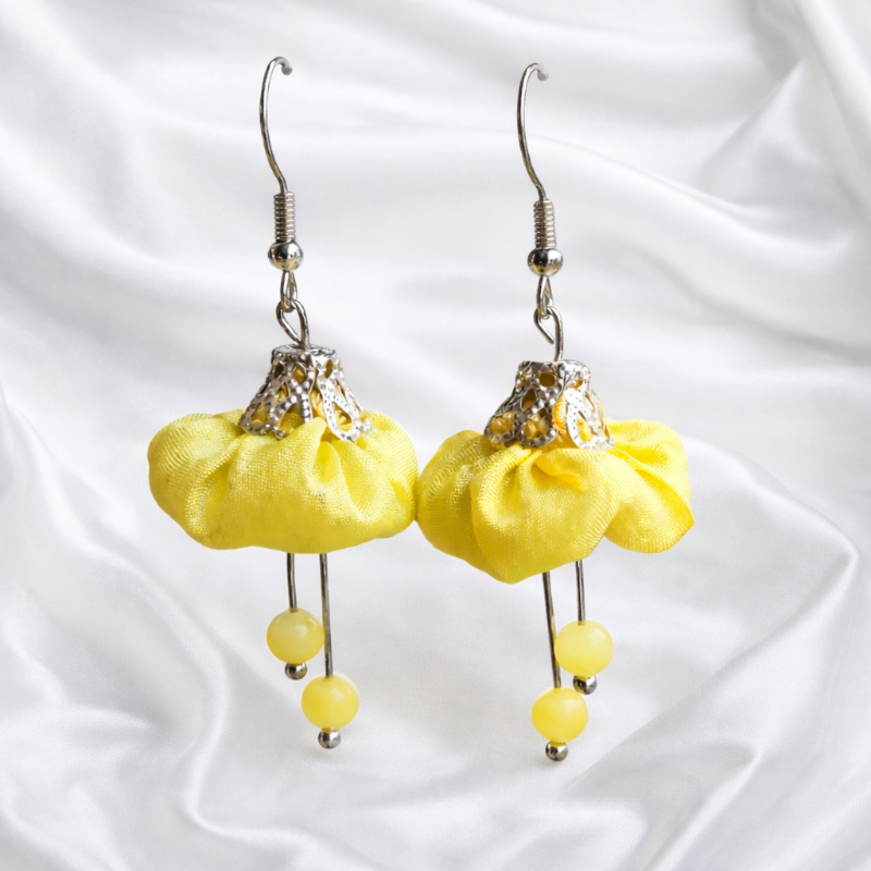 Citromsárga színű virág selyemfülbevaló, kalcedon ásványgyönggyel, fém kiegészítővel, díszkupakkal. Belsejében gyapjú. Elegáns, könnyű, egyedi viselet.