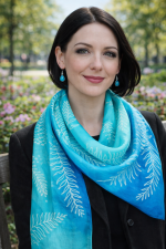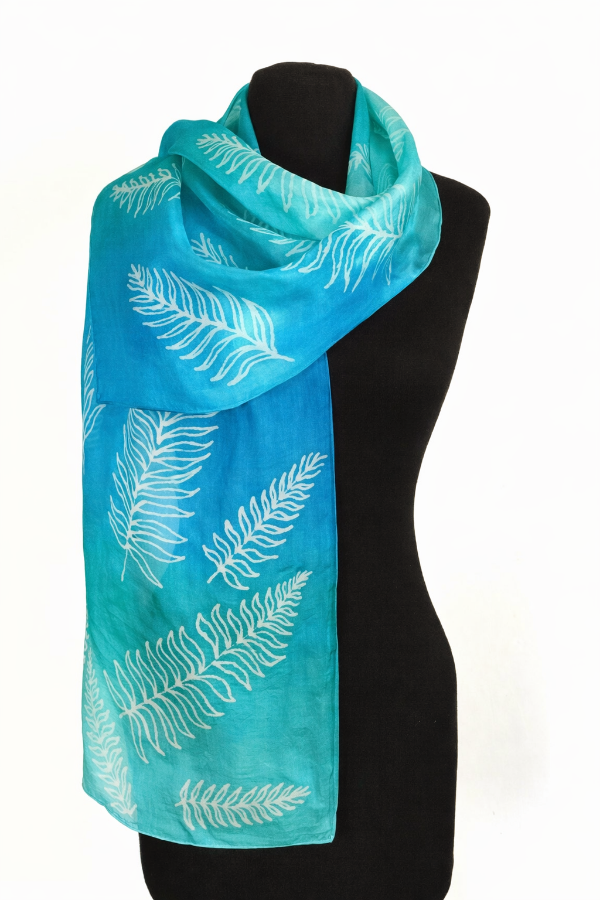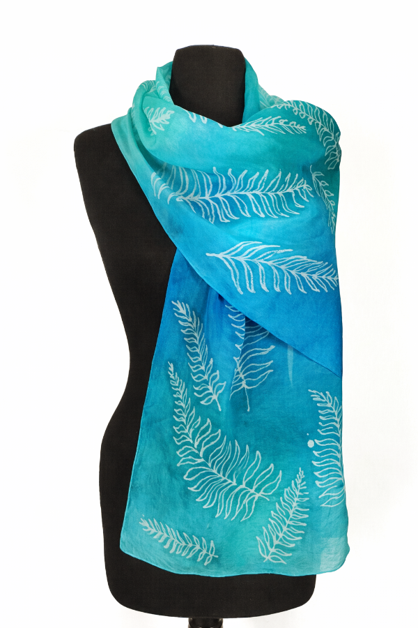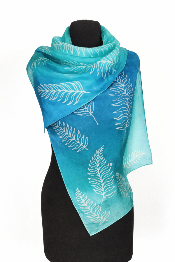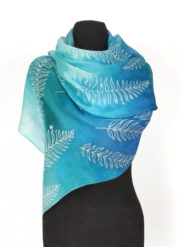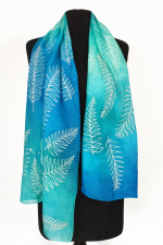 Fehér páfrány batikmintákkal díszített, türkiz, smaragd, menta színű, kézzel festett hernyóselyem sál.