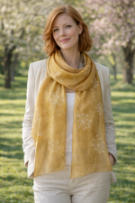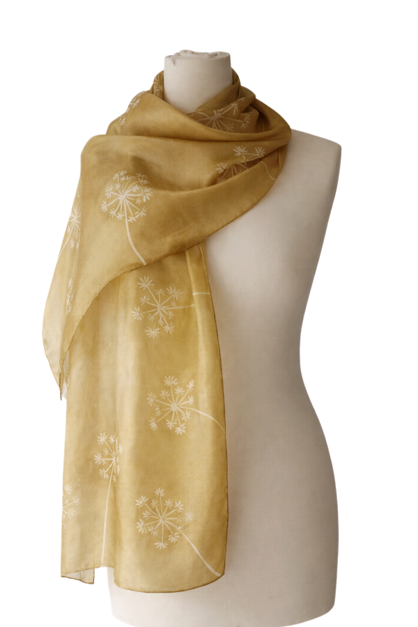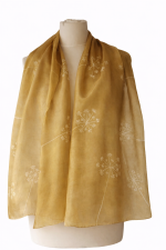 Fehér pitypang mintákkal díszített, arany színű hernyóselyem sál.