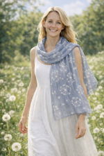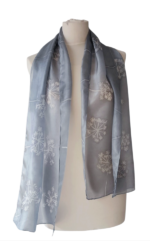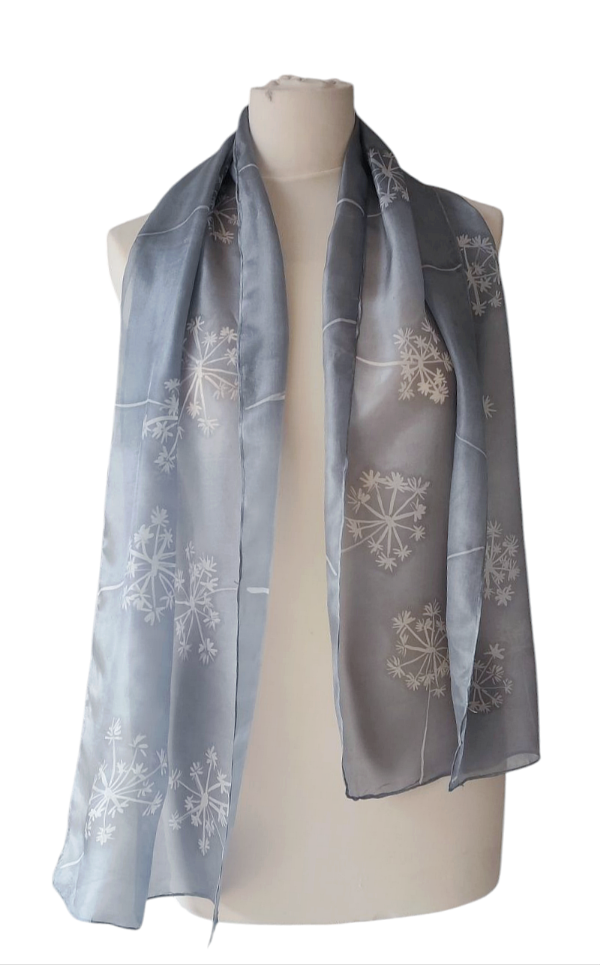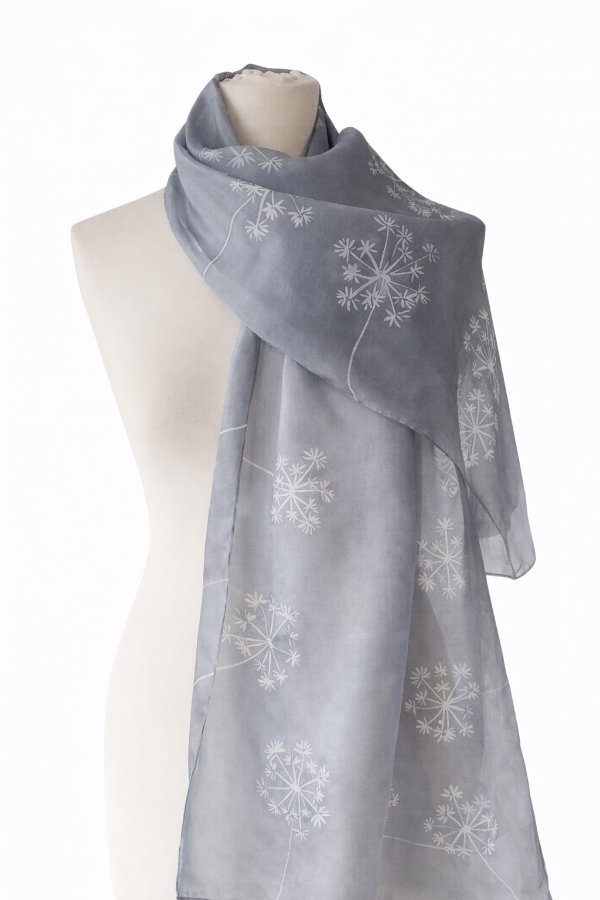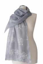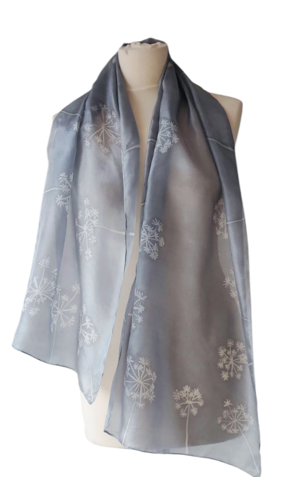 Fehér pitypangmintákkal díszített, ezüstszürke színű, kézzel festett hernyóselyem sál.