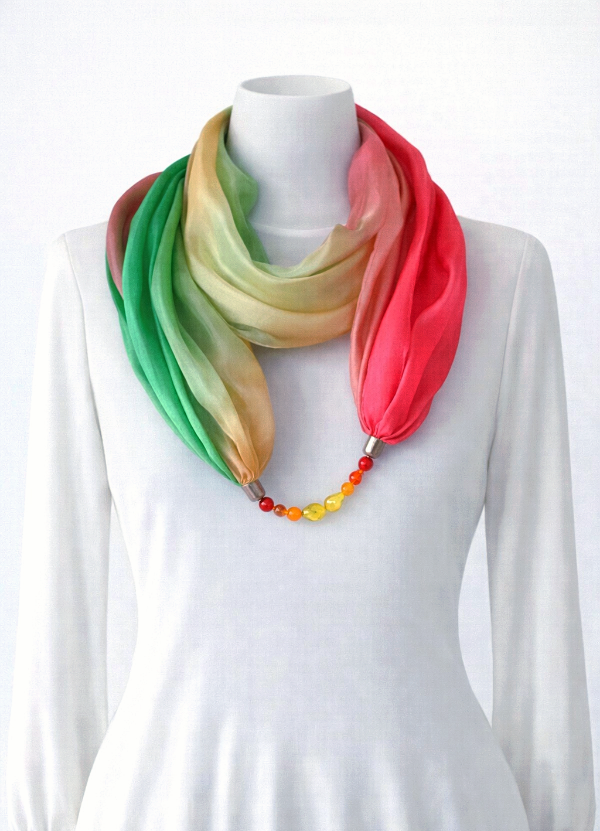 Vörös, fűzöld, bézs, arany színű, kézzel festett hernyóselyem ékszersál ásványgyöngyökkel. A speciális hatású ásványgyöngyök és a selyem kombinációja egyedi kiegészítőt hoz létre, és harmóniát nyújt viselője számára. A körsál vállunkra terítve elegáns és kényelmes stóla viselet is. A selyem sokféle alkalomra hordható, könnyed viselet, az öltözék elegáns kiegészítője, ami színeivel az egyéniségedet, hangulatodat tükrözi. A hernyóselyem különlegessége, hogy nyáron hűt, télen fűt, és véd az elektroszmog hatásaitól. Mérete: 40×150 cm. Tisztítása: kézi mosással, folyékony mosószerrel. Vasalás magas hőfokon, a teljes száradás előtt. Az ásványokat folyóvízzel tisztítsuk rövid ideig, ne áztassuk a selyemmel együtt és ne kezeljük mosószerrel. Az ásványgyöngyöket extra erős, a célra kifejlesztett, vízálló zsinórral fűzzűk fel.