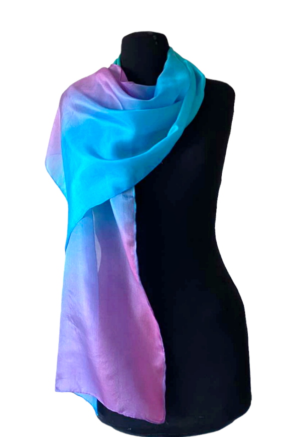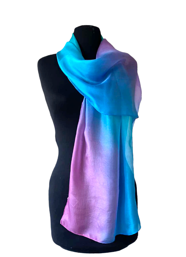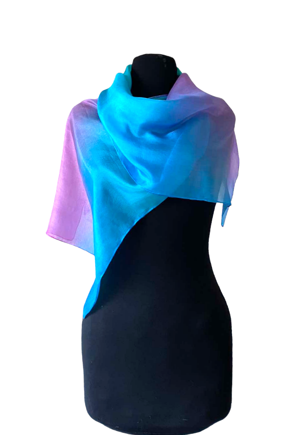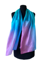 Smaragd, türkiz, orgona, királykék, magenta színátmenetes, kézzel festett hernyóselyem sál. A fátyolsához képest kevésbé átlátszó, klasszikus fényes, selymes, puha hernyóselyem sál.