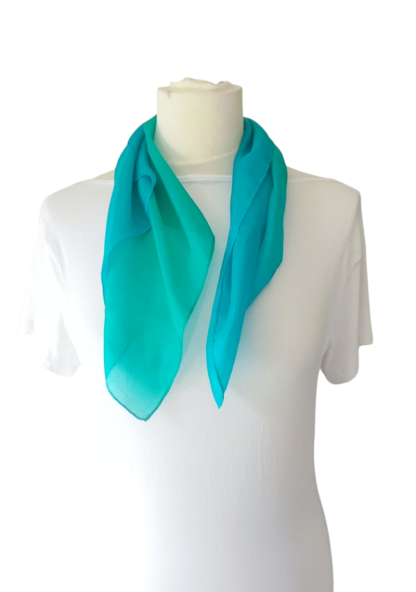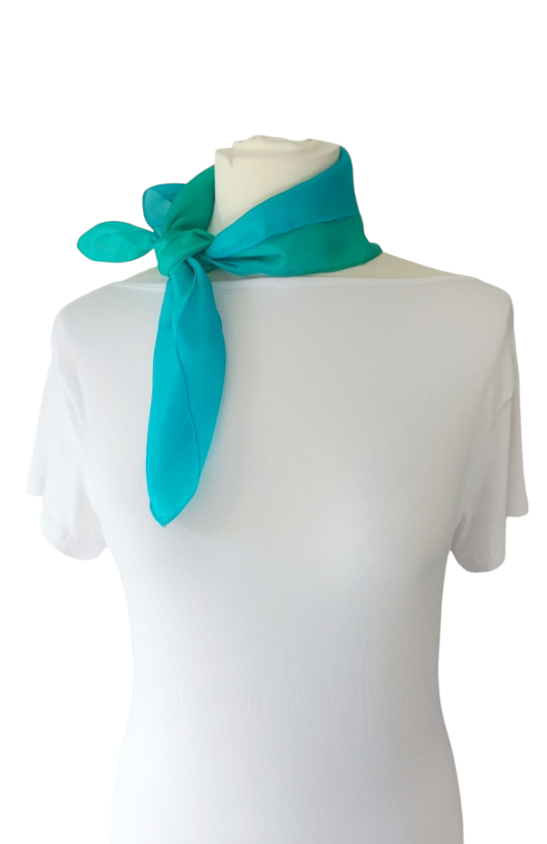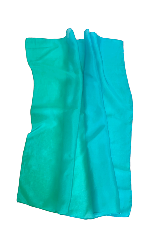Smaragd, türkiz színátmenetes, kézzel festett hernyóselyem kiskendő. Fényes, selymes, puha, a fátyolsához képest kevésbé átlátszó, ‘pongé 5’ hernyóselyem .