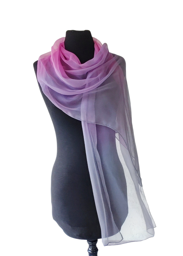 Sötétszürke, pármai rózsa, babarózsa színű, színátmenetes, kézzel festett fátyol (chiffon) hernyóselyem sál. Nem fényes, átlátszóbb és finomabb szövésű anyag, mint a klasszikus pongé típusú fényes hernyóselyemsál. Sokféle alkalomra hordható, könnyed viselet, az öltözék elegáns kiegészítője, ami színeivel az egyéniségedet, hangulatodat tükrözi. A hernyóselyem különlegessége, hogy nyáron hűt, télen fűt, és véd az elektroszmog hatásaitól. Egyedi ajándék hölgyeknek. Bármilyen színösszeállításban és méretben rendelhető. Mérete: 45×180 cm. Tisztítása: kézi mosással, folyékony mosószerrel. Vasalás a teljes száradás előtt, legmagasabb hőfokon.