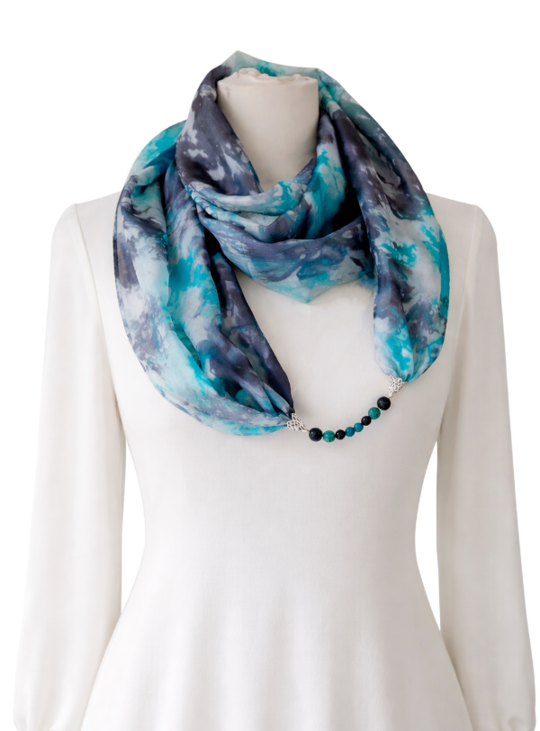 Türkiz, fekete színű, márványos mintájú, kézzel festett hernyóselyem ékszersál, fekete lávakő és türkiz ásványgyöngyökkel. A speciális hatású ásvány-gyöngyök és a selyem kombinációja egyedi kiegészítőt hoz létre, és harmóniát nyújt viselője számára. A körsál vállunkra terítve elegáns és kényelmes stóla viselet is. A selyem sokféle alkalomra hordható, könnyed viselet, az öltözék elegáns kiegészítője, ami színeivel az egyéniségedet, hangulatodat tükrözi. A hernyóselyem különlegessége, hogy nyáron hűt, télen fűt, és véd az elektroszmog hatásaitól. A selyem mérete: 40×150 cm. Tisztítása: kézi mosással, folyékony mosószerrel. Vasalás magas hőfokon, a teljes száradás előtt. Az ásványokat ne áztassuk a selyemmel együtt és ne kezeljük mosószerrel, nedves ronggyal tisztítsuk, ha szükséges. Az ásványgyöngyöket extra erős, a célra kifejlesztett zsinórral fűzzűk fel.