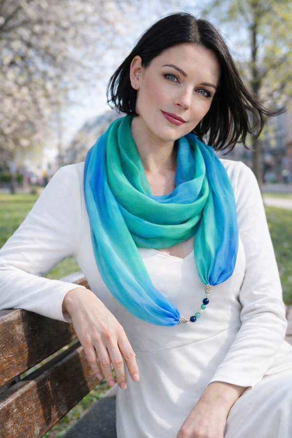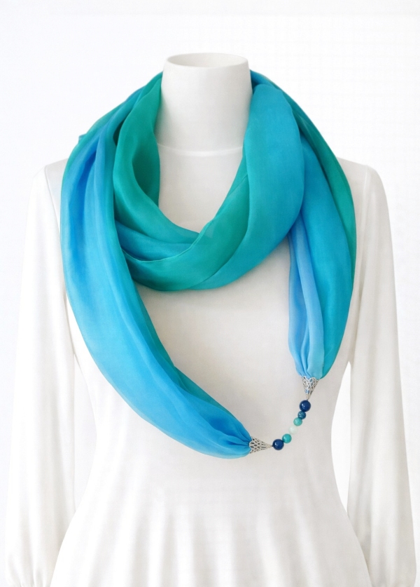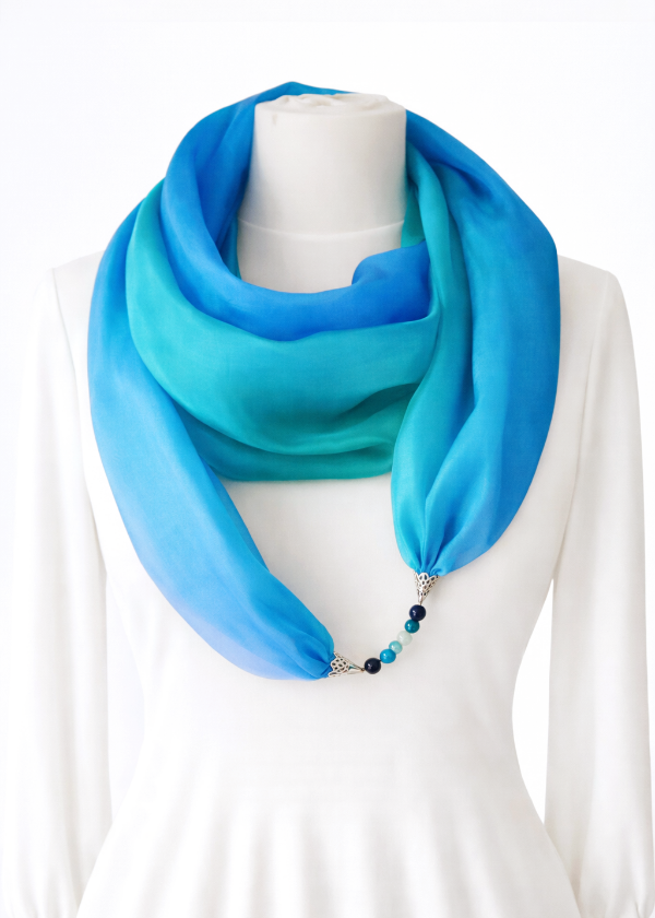 Türkizkék, királykék, türkizzöld színű, kézzel festett hernyóselyem ékszersál, lapis lazuli, türkiz, jáde ásványokkal. A türkiz a kommunikácó köveként segítheti helyes önkifejezésünket és a kommunikációt, a lapis lazuli pedig a tiszta gondolkodást.