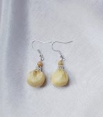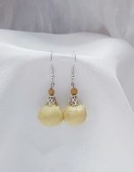 Vanília színű gömb selyemfülbevaló, jáde ásványgyönggyel. Belsejében gyapjú. Fém kiegészítővel, díszkupakkal. Egyedi és könnyű viselet. Hossza kb. 3 cm