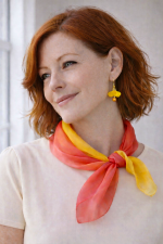 Vörös, narancs, napsárga színátmenetes, kézzel festett hernyóselyem kiskendő. Fényes, selymes, puha, a fátyolsához képest kevésbé átlátszó, ‘pongé 5’ hernyóselyem .