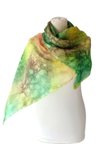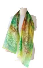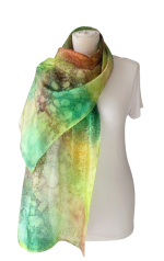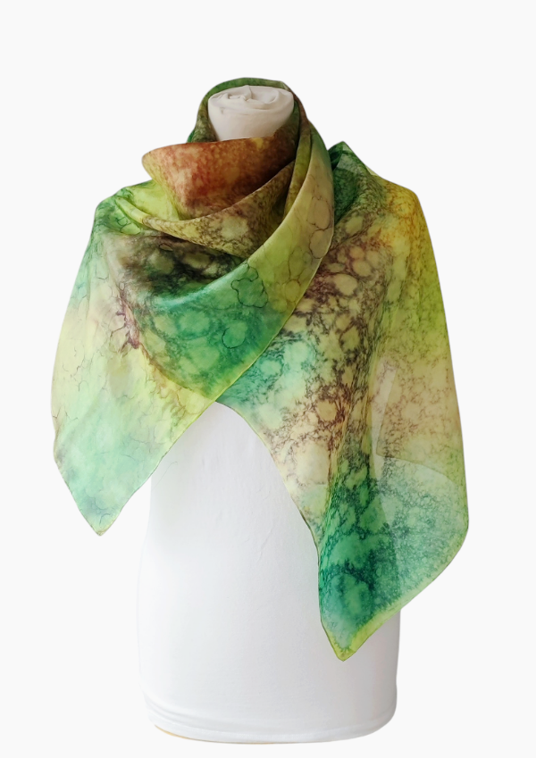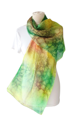 Organikus akvarell mintás hernyóselyem sál bézs, flombzöld, barna, karamell, réz színekben. Sokféle alkalomra hordható, könnyed viselet, az öltözék elegáns kiegészítője, ami színeivel az egyéniségedet, hangulatodat tükrözi. A hernyóselyem különlegessége, hogy nyáron hűt, télen fűt, és véd az elektroszmog hatásaitól.
