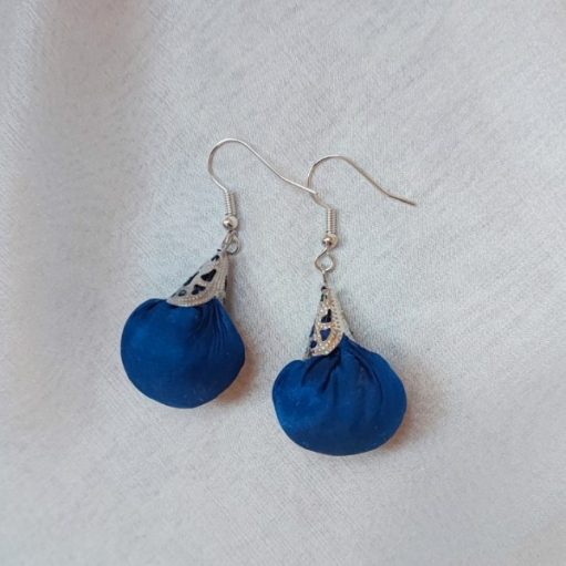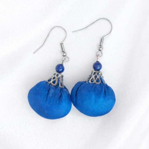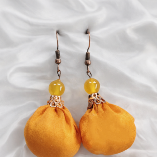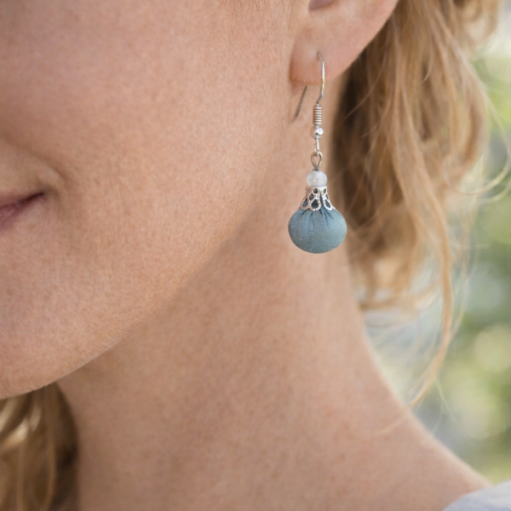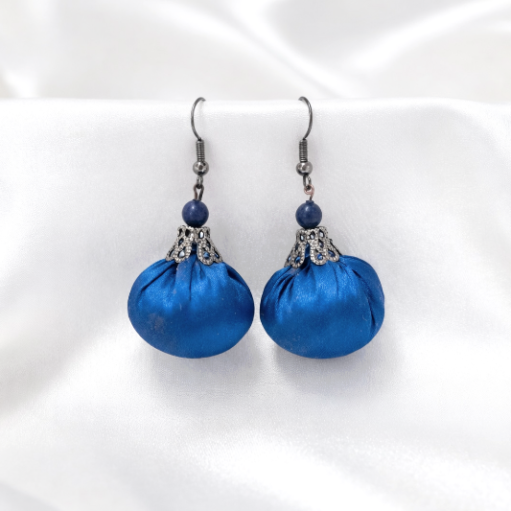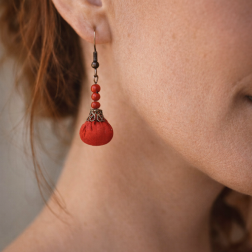 Ásványgyöngyökkel díszített selyem gömbformájú fülbevalók, puha gyapjúval töltve.