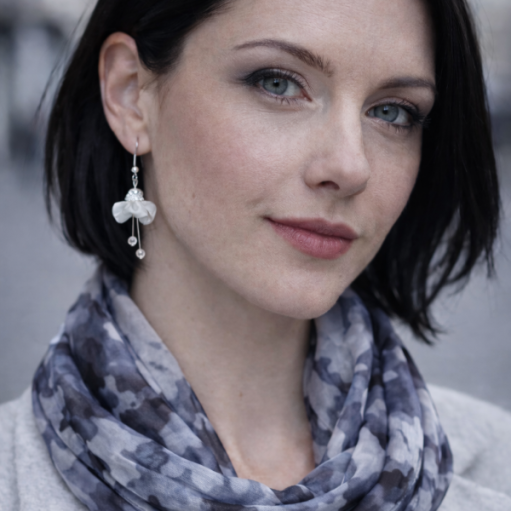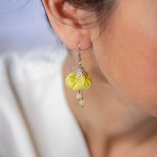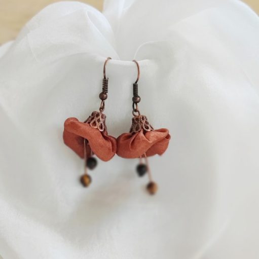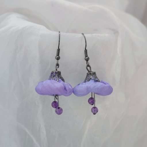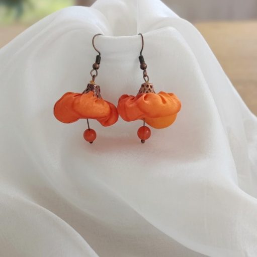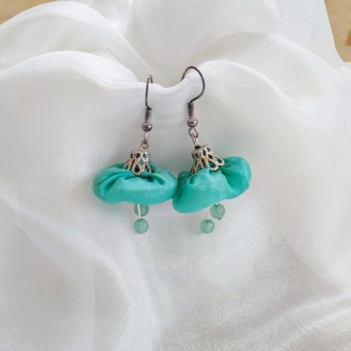 Virágformájú, ásványgyöngyökkel díszített, színes selyemfülbevalók puha gyapjúval töltve.